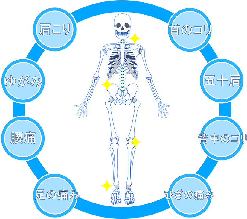 腰、股関節、膝、足、背中などの痛み |